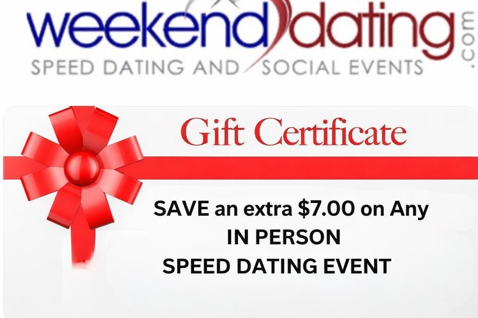 WeekendDating.com is all about creating fun, inclusive spaces where people can meet, connect, and experience something different from the usual online scene. Special promotions like this $7 gift certificate are just one more way we help you take a chance on something new—without breaking the bank. Whether you're coming to a speed dating event to find love or attending a Girls Night Out just to make new friends, you're part of a community that values authenticity, laughter, and genuine interaction. These in-person events are where real connections begin, and every little incentive helps make it easier to show up, meet great people, and enjoy the moment. Our mission at WeekendDating.com has always been to make dating and social events more enjoyable, less awkward, and more accessible. We believe the right environment brings out the best in people—and that’s when the real magic happens. Whether it’s your first event or your fifteenth, we’re here to help you make the most of every moment. |