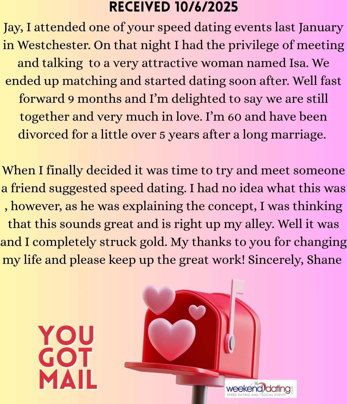 I just wanted to tell you that I attended one of your speed dating events about 4 years ago. I matched up with a really nice girl, and this past April we got married. Things are great, we have a house in Wantagh and are very happy.